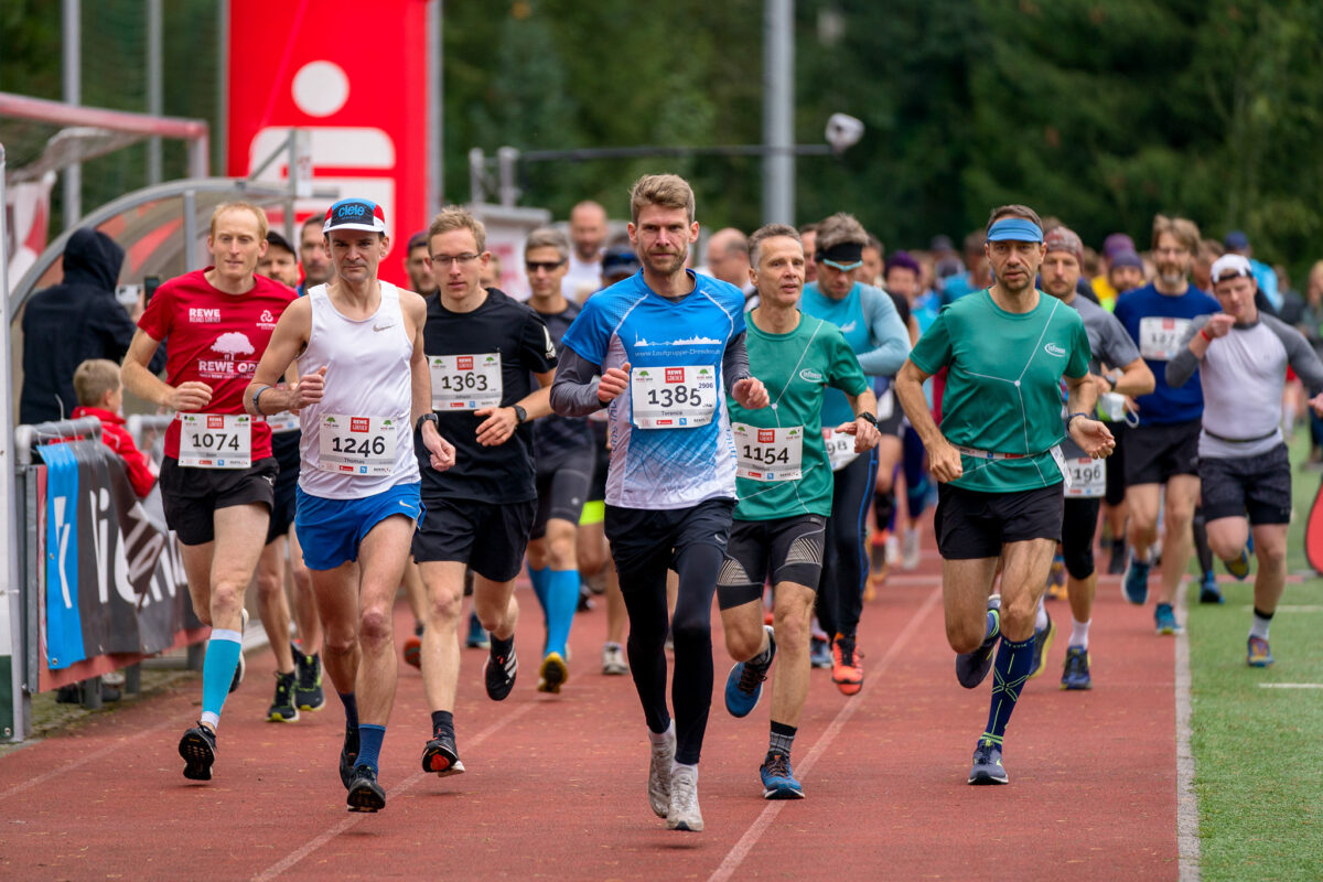 Am Lauftag strahlte die Sonne und Temperaturen irgendwo zwischen 10 und 15°C boten ideale Voraussetzungen für gute Laufleistungen. Ich hatte mich für die 15-km-Strecke angemeldet. Respekt hatte ich besonders vor einer Bergaufpassage ab Kilometer sechs: 65 hm auf 800 m Laufstrecke und damit eine Steigung von gut 8 % — ordentlich für jemanden, der eher auf flachen Strecken unterwegs ist. Aber von vorn: Nach dem Start ging es tendenziell erst einmal bergab. Die Strecke hatte ich mir genau angeschaut. Also hier bloß nicht überpacen. Das Tempo ging gut und wir — mein Trainingspartner Chris und ich — erreichten den steilen Anstieg hoch zum Königsplatz. Wir nahmen Tempo raus, suchten uns einen gängigen Schritt und marschierten die Steigung hinauf. Oben angekommen konnten wir Luft holen, bevor wir den Kannenhenkel hinunterrollten um danach erneut einige Höhenmeter auf dem Weg zur Hofewiese hochklettern zu müssen. Dort angekommen wusste ich, dass es von da an bis zum Ziel fast nur noch seicht bergab rollt. Also Handbremse komplett gelöst, den immer noch recht frischen Beinen einfach freien Lauf gelassen und mit einem breiten Lächeln durch den Zielbogen gerannt.